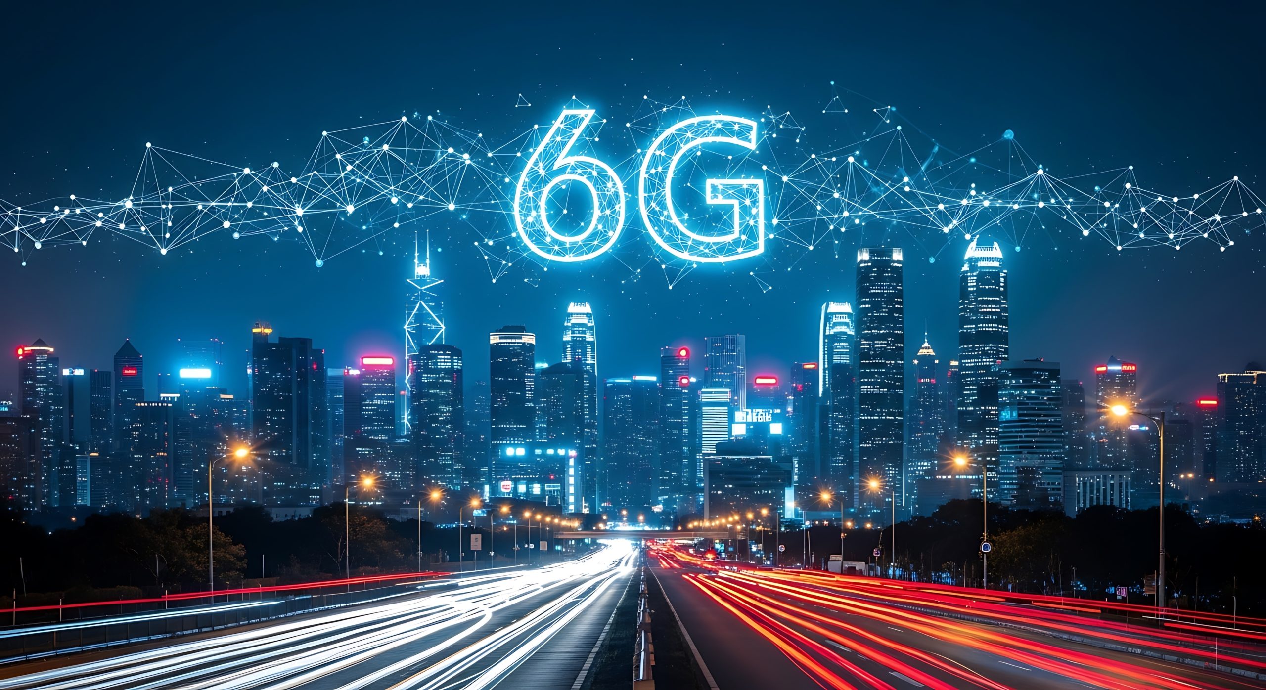 Futuristic cityscape at night with 6g network visualization connecting skyscrapers and light trails