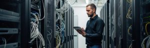 IT worker in a server room with tablet, inspecting complex cabling and racks